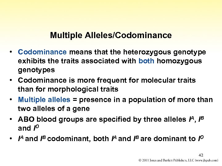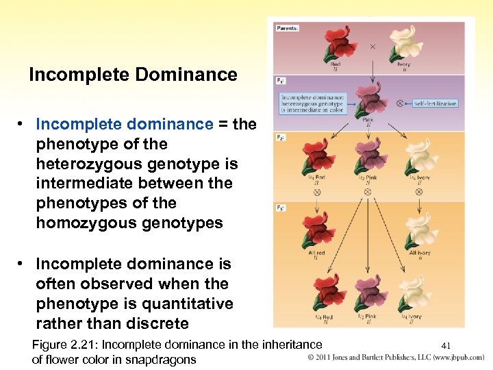 Incomplete Dominance • Incomplete dominance = the phenotype of the heterozygous genotype is intermediate between the phenotypes of the homozygous genotypes • Incomplete dominance is often observed when the phenotype is quantitative rather than discrete Figure 2. 21: Incomplete dominance in the inheritance of flower color in snapdragons 41