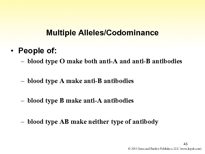 Multiple Alleles/Codominance • People of: – blood type O make both anti-A and anti-B antibodies – blood type A make anti-B antibodies – blood type B make anti-A antibodies – blood type AB make neither type of antibody 43