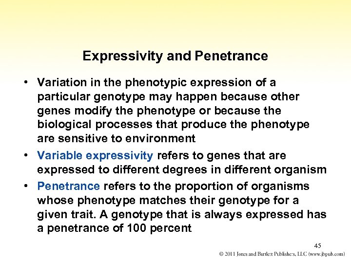 Expressivity and Penetrance • Variation in the phenotypic expression of a particular genotype may happen because other genes modify the phenotype or because the biological processes that produce the phenotype are sensitive to environment • Variable expressivity refers to genes that are expressed to different degrees in different organism • Penetrance refers to the proportion of organisms whose phenotype matches their genotype for a given trait. A genotype that is always expressed has a penetrance of 100 percent 45