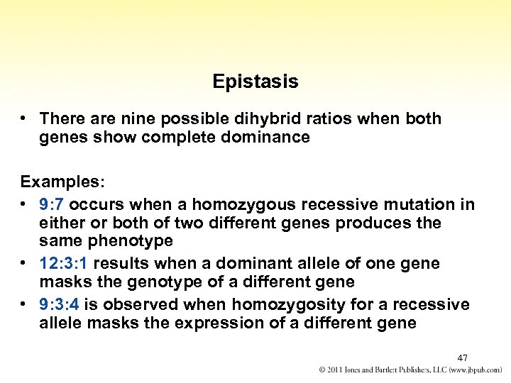 Epistasis • Epistasis refers to any type of gene interaction that results in the F 2 dihybrid ratio of 9: 3: 3: 1 being modified into some other ratio • In a more general sense, it means that one gene is masking the expression of the other • Flower color in peas: formation of the purple pigment requires the dominant allele of both the C and P genes: the F 2 ratio is modified to 9 purple: 7 white Figure 2. 24: A cross showing epistasis in the determination of flower color in peas 46