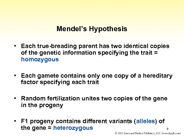 Mendel’s Hypothesis • Each true-breading parent has two identical copies of the genetic information specifying the trait = homozygous • Each gamete contains only one copy of a hereditary factor specifying each trait • Random fertilization unites two copies of the gene in the progeny • F 1 progeny contains different variants (alleles) of the gene = heterozygous 9