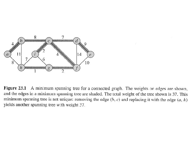 Definition • A spanning tree whose weight is minimum over all spanning trees is called a Minimum Spanning Tree, or MST. • Example: • In this example, there is more than one MST. Replace edge (b, c) by (a, h). Get a different spanning tree with the same weight.