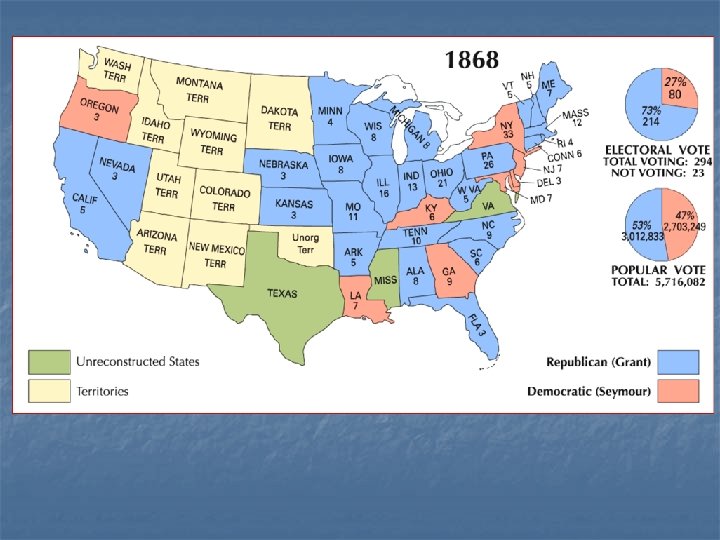 The “BLOODY SHIRT” Elects Grant n n n n Democrats divided between eastern and western democrats. Nominate Horatio Seymour Republicans wave the “Bloody Shirt” Republican Platform Democrats divided over redemption of Bonds. Grants wins easily in the electoral college, but by only 300, 000 votes. Impact of Black vote.