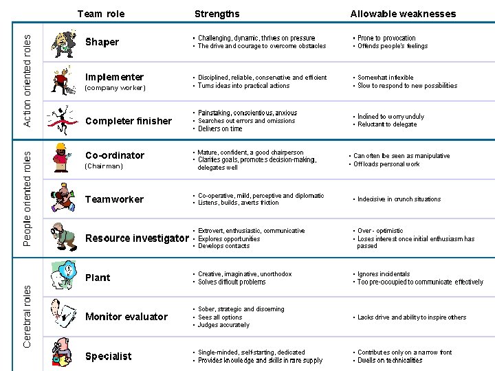 Belbin: Theory of group roles Leader Shaper Plant Monitorevaluator Resourceinvestigator Company worker Team worker Finisher Expert Coordinator Promotes activity – dominant, extrovert Thoughtful and thought provoking, ideas person Criticises others’ ideas, brings the team down to earth Extrovert, networker, looks for alternative solutions Administrator, organiser Concerned with relationships Progress chaser As required by the project