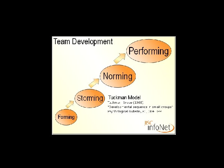 Tuckman: Stages of group development 1. Forming Awareness 2. Storming Conflict 3. Norming Co-operation 4. Performing Productivity 5. Dorming Adjournment