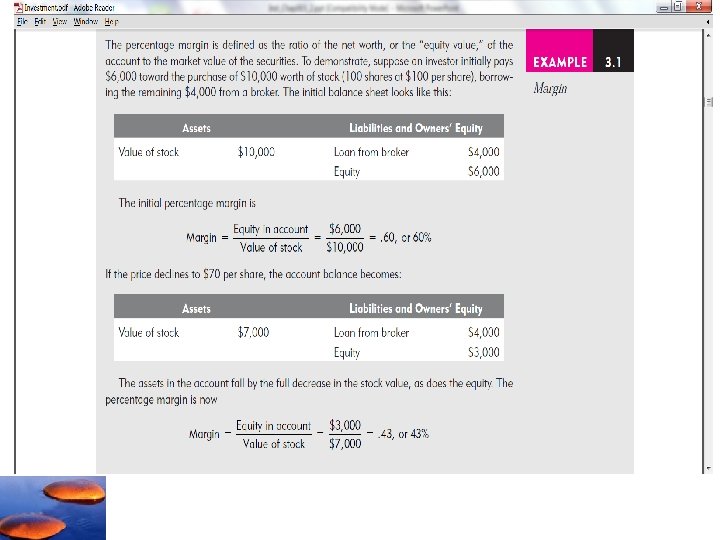 Buying on Margin • Purchasing stocks on margin means the investor: 1 -Pays in cash part of the purchase price of the stock, 2 -Borrows the remaining part of the purchase price of the stock from a broker. • The Board of Governors of the Federal Reserve System limits the margin loans and argue that at least 50% of the purchase price must be paid in cash • Thus, Initial Margin Requirement IMR is the minimum % initial investor equity. • 1 -IMR= maximum % the investor can borrow from the broker. 3 -20