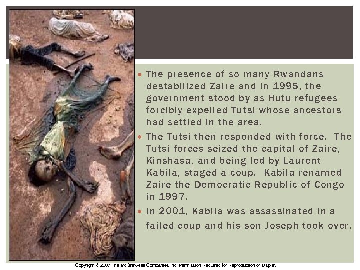 RWANDA AND BURUNDI • In late 1993, about 50, 000 Burundians, mostly Hutu, lost their lives in violence following a Tutsi-sponsored coup attempt. • In 1994, an estimated 500, 000 Rwandans were killed. Most were Tutsi slaughtered by Hutu. A Tutsi army then captured the capital of Rwanda, Kigali, leading some 2 million to flee to refugee camps in Zaire and other neighboring countries. Thousands died due to disease and starvation. Refugee camp in Zaire, 1994 Copyright © 2007 The Mc. Graw-Hill Companies Inc. Permission Required for Reproduction or Display.