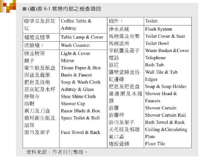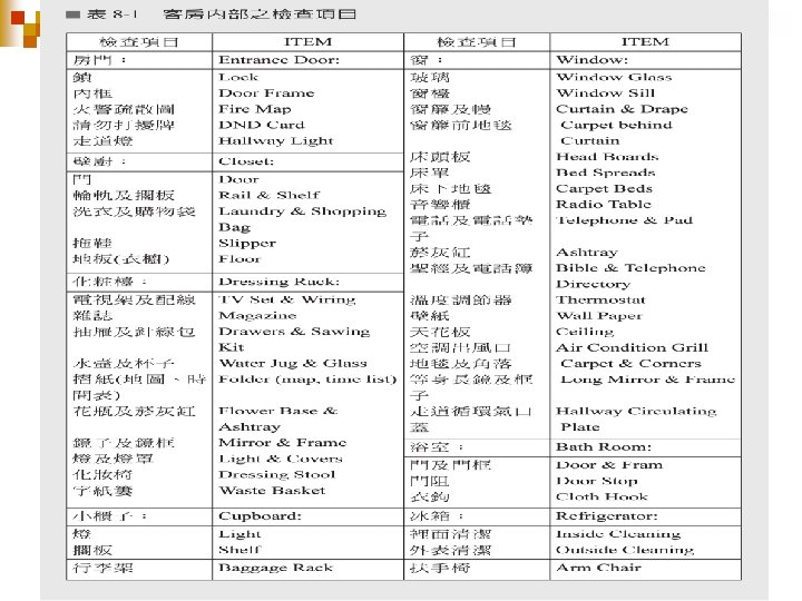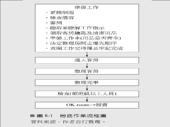 Chapter 8 房務部組織與職責 服務生與旅客之關係 房務作業程序 • 準備 作 • 如何進入房間 • 客房整理 • OK room之清潔檢查 • 客房備品與裝備 • 床鋪翻面使用之作業 • 客房作業要領 • 設備維護與保養 • 財產保管 • 維護制度之建立