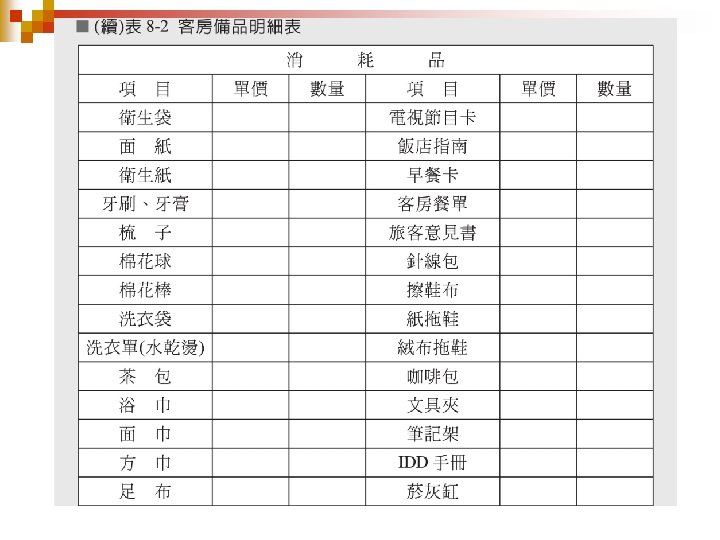 (二 ) 程單位 1. 公共區域 (如櫃檯等 )設備之維護與保養。 2. 客房設備與備品損壞、故障之維修與保養。 3. 其他。 (三 )採購單位 1. 生財器具、設備之採購。 2. 添購適當備品、電腦設備及通訊系統。 3. 員 制服 (uniform)訂製。 4. 其他。