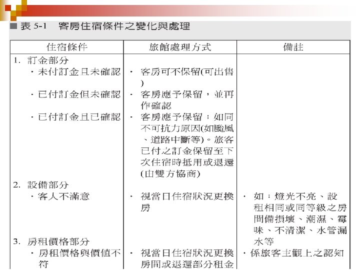 問題 PROBLEMS & DISCUSSION 討論 1. 如何掌握訂房,增加營收 ? 2. 訂房作業查核之重要性為何 ? 3. 如何才算是好的客房銷售 ? 4. 如何掌控訂房各項作業 ? 5. 如何妥善為客人安排客房 ? 6. 連 續 假 日 時 , 館 通 常 會 優 先 安 排 住 宿 旅 兩晚以上之客人 , 理由何在 ? 7. 旅 館 之 主 管 應 如 何 處 理 (解 決 )超 額 訂 房 之客人問題 ? 8. 旅館業者對 no show 的顧客應如何處理 ?