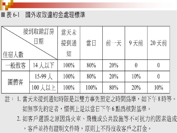 (一 )超額訂房 (或訂房超收 ) (1)遠期訂房之控制與計算 (2)即期訂房之控制與計算 (3)在房間不夠時處理訂房要求之原 則 (二 )更改與取消訂房 (三 )保證訂房 (四 )無訂房之旅客 (五 )客滿 (六 )取消訂房與沒收違約金