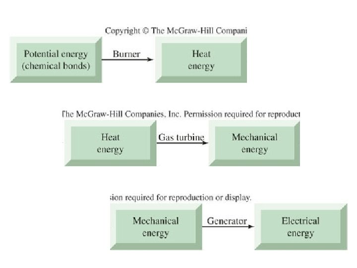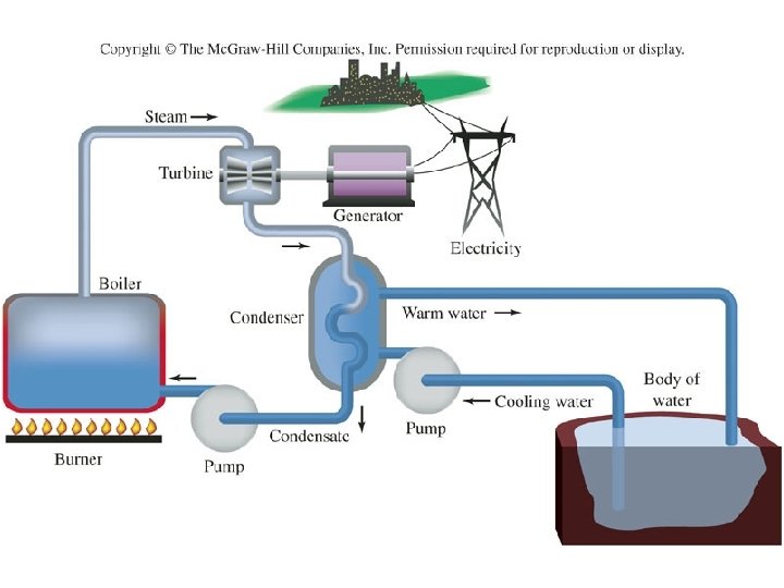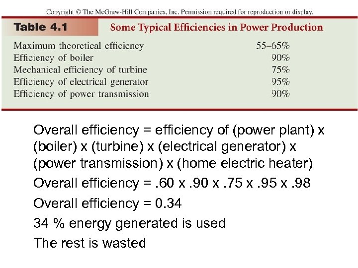 Overall efficiency = efficiency of (power plant) x (boiler) x (turbine) x (electrical generator) x (power transmission) x (home electric heater) Overall efficiency =. 60 x. 90 x. 75 x. 98 Overall efficiency = 0. 34 34 % energy generated is used The rest is wasted