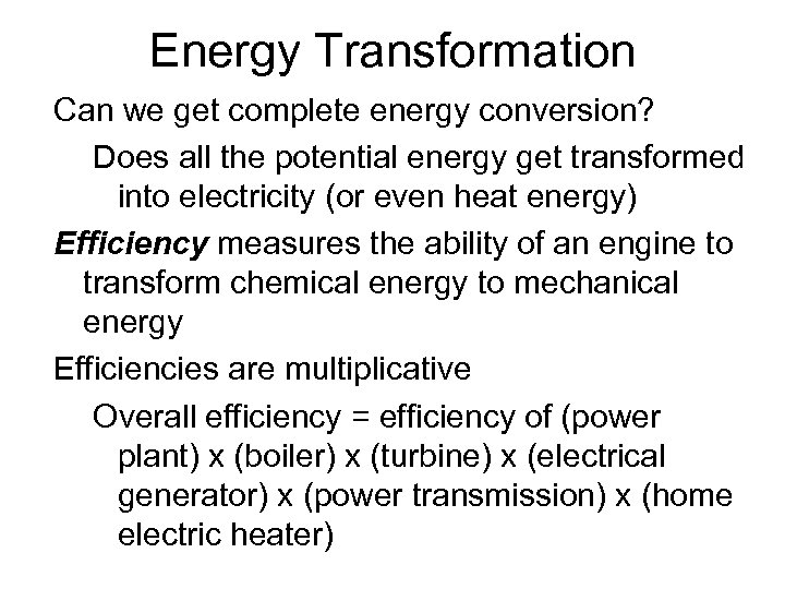 Energy Transformation Can we get complete energy conversion? Does all the potential energy get transformed into electricity (or even heat energy) Efficiency measures the ability of an engine to transform chemical energy to mechanical energy Efficiencies are multiplicative Overall efficiency = efficiency of (power plant) x (boiler) x (turbine) x (electrical generator) x (power transmission) x (home electric heater)