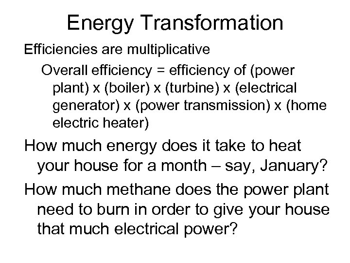 Energy Transformation Efficiencies are multiplicative Overall efficiency = efficiency of (power plant) x (boiler) x (turbine) x (electrical generator) x (power transmission) x (home electric heater) How much energy does it take to heat your house for a month – say, January? How much methane does the power plant need to burn in order to give your house that much electrical power?