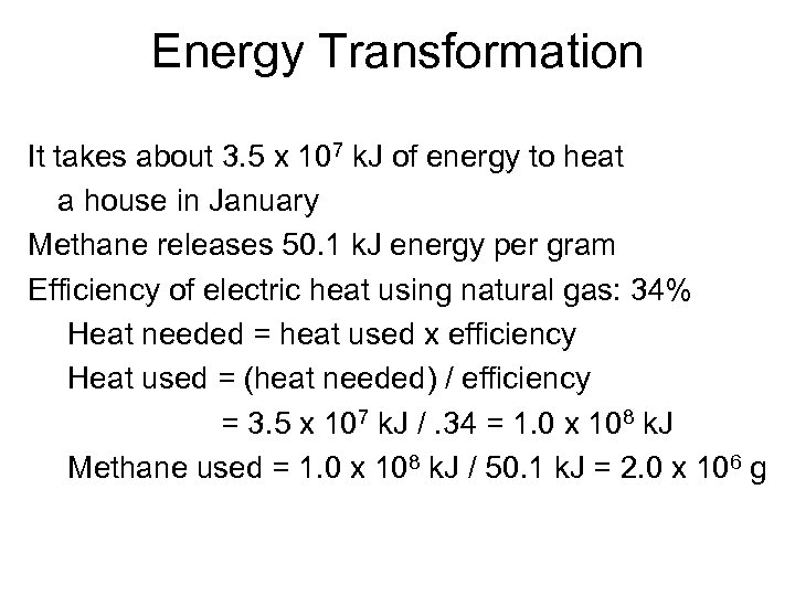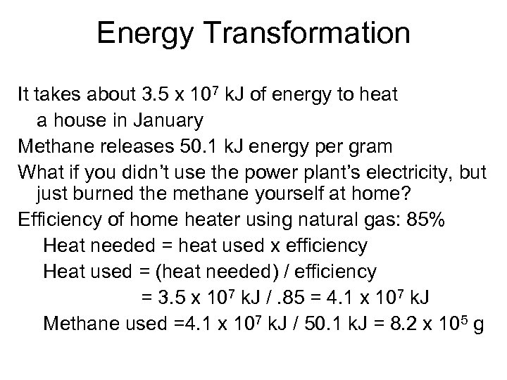 Energy Transformation It takes about 3. 5 x 107 k. J of energy to heat a house in January Methane releases 50. 1 k. J energy per gram What if you didn’t use the power plant’s electricity, but just burned the methane yourself at home? Efficiency of home heater using natural gas: 85% Heat needed = heat used x efficiency Heat used = (heat needed) / efficiency = 3. 5 x 107 k. J /. 85 = 4. 1 x 107 k. J Methane used =4. 1 x 107 k. J / 50. 1 k. J = 8. 2 x 105 g