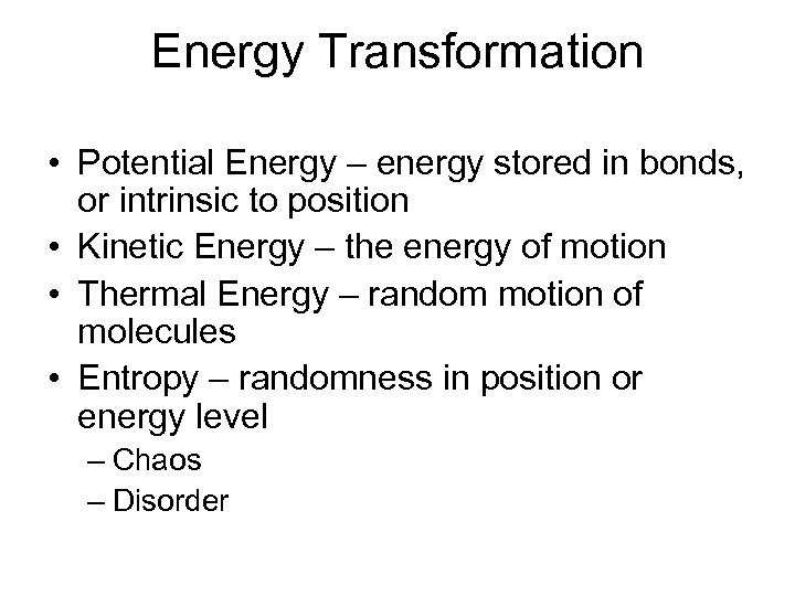 Energy Transformation • Potential Energy – energy stored in bonds, or intrinsic to position • Kinetic Energy – the energy of motion • Thermal Energy – random motion of molecules • Entropy – randomness in position or energy level – Chaos – Disorder