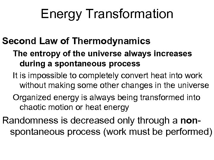 Energy Transformation Second Law of Thermodynamics The entropy of the universe always increases during a spontaneous process It is impossible to completely convert heat into work without making some other changes in the universe Organized energy is always being transformed into chaotic motion or heat energy Randomness is decreased only through a nonspontaneous process (work must be performed)