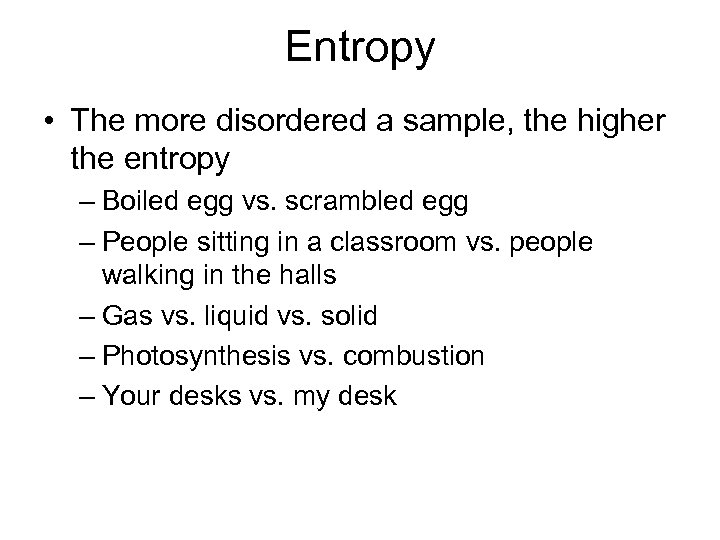 Entropy • The more disordered a sample, the higher the entropy – Boiled egg vs. scrambled egg – People sitting in a classroom vs. people walking in the halls – Gas vs. liquid vs. solid – Photosynthesis vs. combustion – Your desks vs. my desk