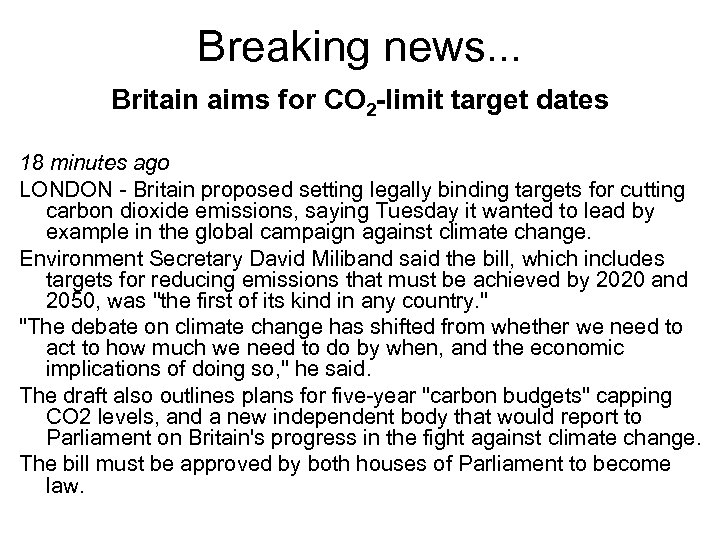 Breaking news. . . Britain aims for CO 2 -limit target dates 18 minutes ago LONDON - Britain proposed setting legally binding targets for cutting carbon dioxide emissions, saying Tuesday it wanted to lead by example in the global campaign against climate change. Environment Secretary David Miliband said the bill, which includes targets for reducing emissions that must be achieved by 2020 and 2050, was "the first of its kind in any country. " "The debate on climate change has shifted from whether we need to act to how much we need to do by when, and the economic implications of doing so, " he said. The draft also outlines plans for five-year "carbon budgets" capping CO 2 levels, and a new independent body that would report to Parliament on Britain's progress in the fight against climate change. The bill must be approved by both houses of Parliament to become law.