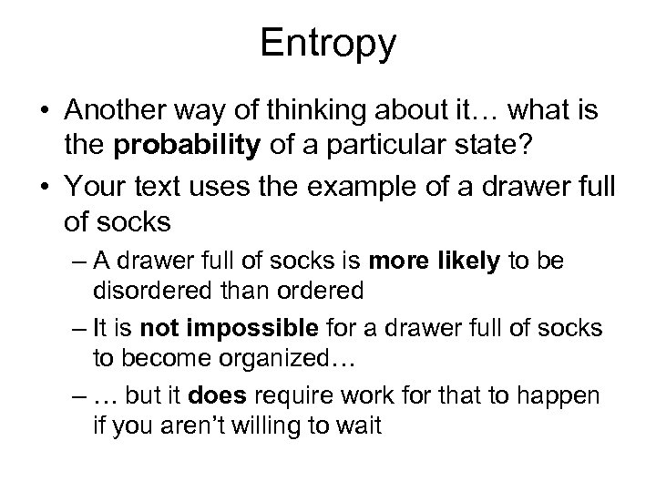 Entropy • Another way of thinking about it… what is the probability of a particular state? • Your text uses the example of a drawer full of socks – A drawer full of socks is more likely to be disordered than ordered – It is not impossible for a drawer full of socks to become organized… – … but it does require work for that to happen if you aren’t willing to wait