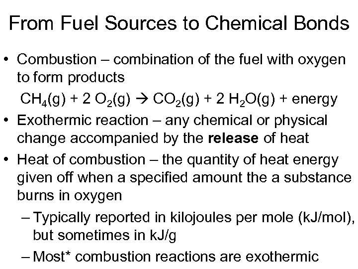 From Fuel Sources to Chemical Bonds • Combustion – combination of the fuel with oxygen to form products CH 4(g) + 2 O 2(g) CO 2(g) + 2 H 2 O(g) + energy • Exothermic reaction – any chemical or physical change accompanied by the release of heat • Heat of combustion – the quantity of heat energy given off when a specified amount the a substance burns in oxygen – Typically reported in kilojoules per mole (k. J/mol), but sometimes in k. J/g – Most* combustion reactions are exothermic