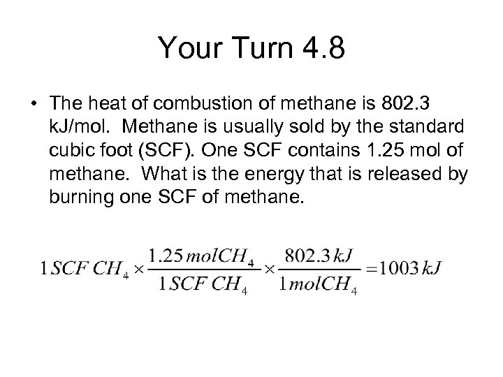 Your Turn 4. 8 • The heat of combustion of methane is 802. 3 k. J/mol. Methane is usually sold by the standard cubic foot (SCF). One SCF contains 1. 25 mol of methane. What is the energy that is released by burning one SCF of methane.