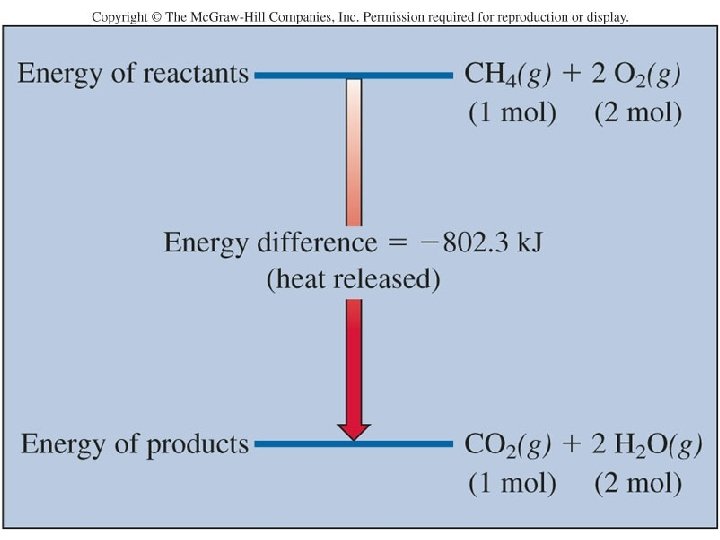 From Fuel Sources to Chemical Bonds • CH 4(g) + 2 O 2(g) CO 2(g) + 2 H 2 O(g) + energy • Heat of combustion of methane is -50. 1 k. J/g – For every gram of methane burned we get 50. 1 k. J energy – For every mole of methane burned we get 802. 3 k. J energy • The combustion of one mole of methane will always produce one mole of carbon dioxide, two moles of water, and 802. 3 kilojoules of heat energy