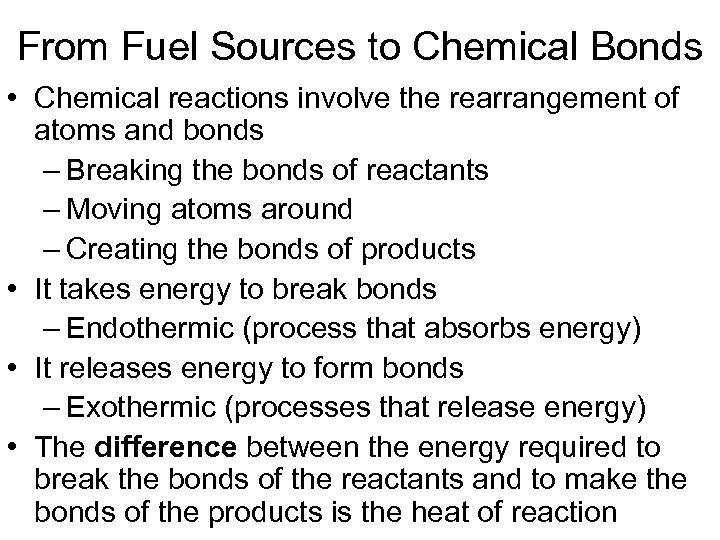 From Fuel Sources to Chemical Bonds • Chemical reactions involve the rearrangement of atoms and bonds – Breaking the bonds of reactants – Moving atoms around – Creating the bonds of products • It takes energy to break bonds – Endothermic (process that absorbs energy) • It releases energy to form bonds – Exothermic (processes that release energy) • The difference between the energy required to break the bonds of the reactants and to make the bonds of the products is the heat of reaction