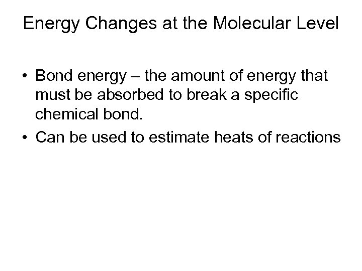 Energy Changes at the Molecular Level • Bond energy – the amount of energy that must be absorbed to break a specific chemical bond. • Can be used to estimate heats of reactions