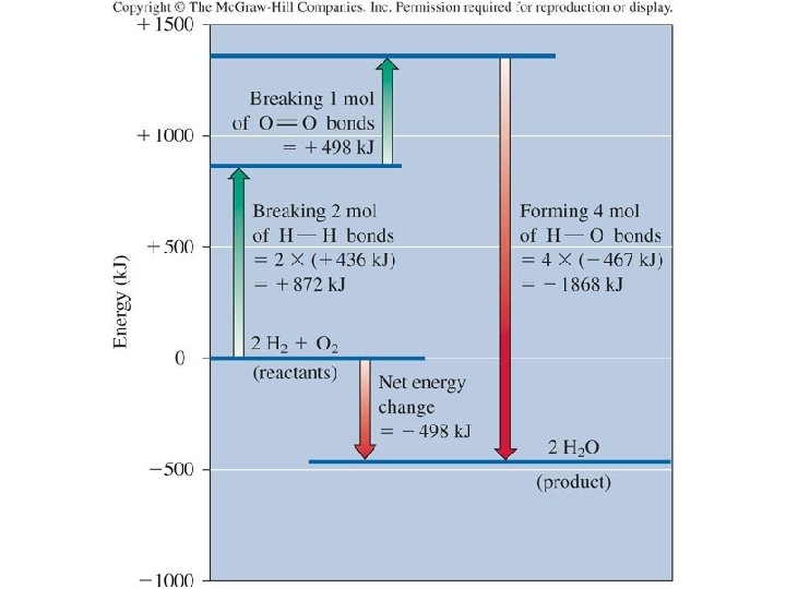 Formation of Water 2 H 2(g) + O 2(g) 2 H 2 O(g) + energy Reactants Hydrogen (2 molecules, each with 1 H-H bond) Oxygen (one O=O double bond) Products Water (2 molecules, each with 2 H-O bonds) Energy is released because there is energy left over 872 k. J + 498 k. J – 1868 k. J = – 498 k. J (exothermic)