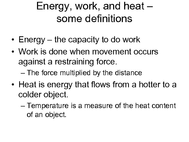 Energy, work, and heat – some definitions • Energy – the capacity to do work • Work is done when movement occurs against a restraining force. – The force multiplied by the distance • Heat is energy that flows from a hotter to a colder object. – Temperature is a measure of the heat content of an object.