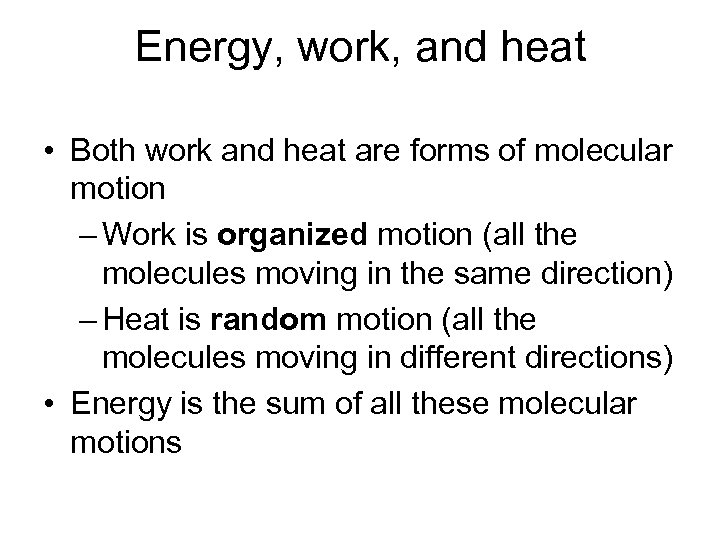 Energy, work, and heat • Both work and heat are forms of molecular motion – Work is organized motion (all the molecules moving in the same direction) – Heat is random motion (all the molecules moving in different directions) • Energy is the sum of all these molecular motions