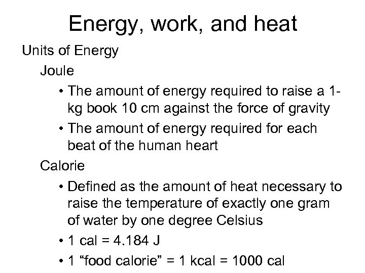Energy, work, and heat Units of Energy Joule • The amount of energy required to raise a 1 kg book 10 cm against the force of gravity • The amount of energy required for each beat of the human heart Calorie • Defined as the amount of heat necessary to raise the temperature of exactly one gram of water by one degree Celsius • 1 cal = 4. 184 J • 1 “food calorie” = 1 kcal = 1000 cal