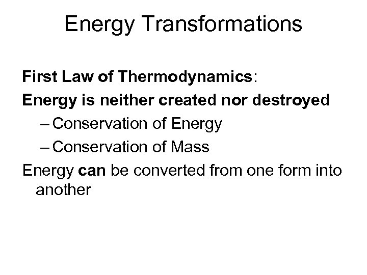 Energy Transformations First Law of Thermodynamics: Energy is neither created nor destroyed – Conservation of Energy – Conservation of Mass Energy can be converted from one form into another