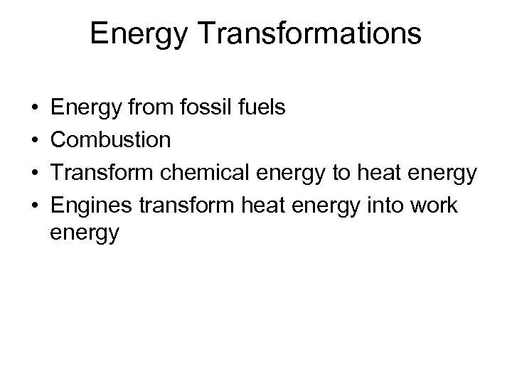 Energy Transformations • • Energy from fossil fuels Combustion Transform chemical energy to heat energy Engines transform heat energy into work energy