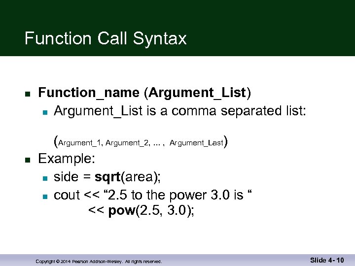 Function Call Syntax n n Function_name (Argument_List) n Argument_List is a comma separated list: (Argument_1, Argument_2, … , Argument_Last) Example: n side = sqrt(area); n cout << “ 2. 5 to the power 3. 0 is “ << pow(2. 5, 3. 0); Copyright © 2014 Pearson Addison-Wesley. All rights reserved. Slide 4 - 10