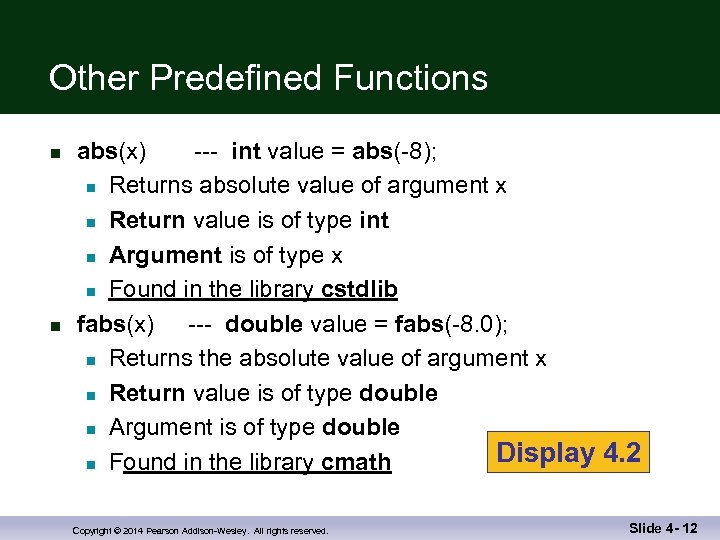 Other Predefined Functions n n abs(x) --- int value = abs(-8); n Returns absolute value of argument x n Return value is of type int n Argument is of type x n Found in the library cstdlib fabs(x) --- double value = fabs(-8. 0); n Returns the absolute value of argument x n Return value is of type double n Argument is of type double Display 4. 2 n Found in the library cmath Copyright © 2014 Pearson Addison-Wesley. All rights reserved. Slide 4 - 12