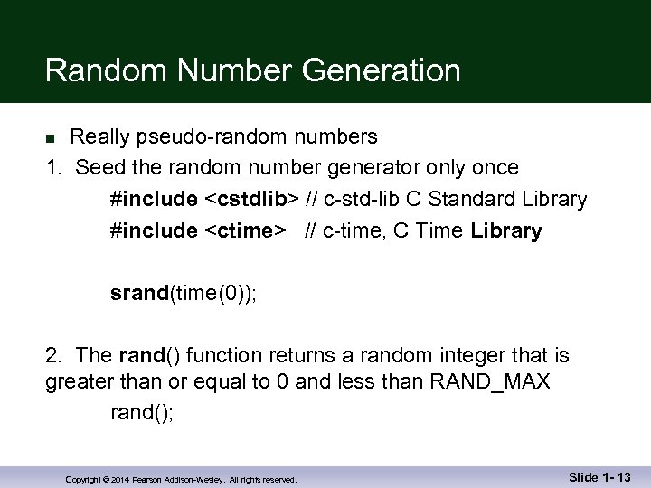 Random Number Generation Really pseudo-random numbers 1. Seed the random number generator only once #include <cstdlib> // c-std-lib C Standard Library #include <ctime> // c-time, C Time Library n srand(time(0)); 2. The rand() function returns a random integer that is greater than or equal to 0 and less than RAND_MAX rand(); Copyright © 2014 Pearson Addison-Wesley. All rights reserved. Slide 1 - 13