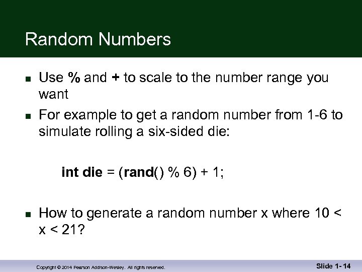 Random Numbers n n Use % and + to scale to the number range you want For example to get a random number from 1 -6 to simulate rolling a six-sided die: int die = (rand() % 6) + 1; n How to generate a random number x where 10 < x < 21? Copyright © 2014 Pearson Addison-Wesley. All rights reserved. Slide 1 - 14