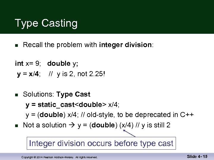 Type Casting n Recall the problem with integer division: int x= 9; double y; y = x/4; // y is 2, not 2. 25! n n Solutions: Type Cast y = static_cast<double> x/4; y = (double) x/4; // old-style, to be deprecated in C++ Not a solution y = (double) (x/4) // y is still 2 Integer division occurs before type cast Copyright © 2014 Pearson Addison-Wesley. All rights reserved. Slide 4 - 15