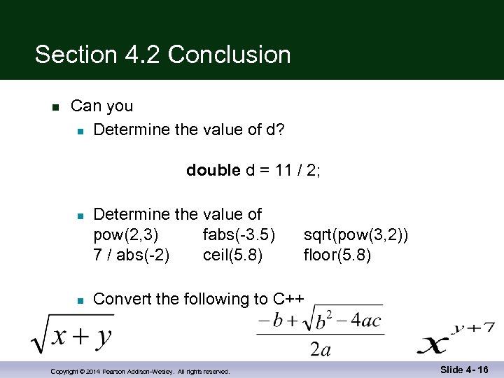 Section 4. 2 Conclusion n Can you n Determine the value of d? double d = 11 / 2; n n Determine the value of pow(2, 3) fabs(-3. 5) 7 / abs(-2) ceil(5. 8) sqrt(pow(3, 2)) floor(5. 8) Convert the following to C++ Copyright © 2014 Pearson Addison-Wesley. All rights reserved. Slide 4 - 16