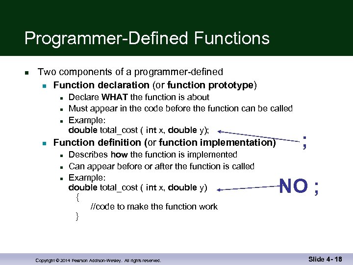 Programmer-Defined Functions n Two components of a programmer-defined n Function declaration (or function prototype) n n Declare WHAT the function is about Must appear in the code before the function can be called Example: double total_cost ( int x, double y); Function definition (or function implementation) n n n Describes how the function is implemented Can appear before or after the function is called Example: double total_cost ( int x, double y) { //code to make the function work } Copyright © 2014 Pearson Addison-Wesley. All rights reserved. ; NO ; Slide 4 - 18