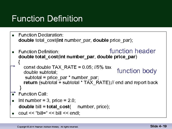 Function Definition n n Function Declaration: double total_cost(int number_par, double price_par); Function Definition: function header double total_cost(int number_par, double price_par) { const double TAX_RATE = 0. 05; //5% tax function body double subtotal; subtotal = price_par * number_par; return (subtotal + subtotal * TAX_RATE); // end and report back } Function Call: Int number = 3, price = 2. 0; double bill = total_cost( number, price); cout << “bill=“ << bill << endl; Copyright © 2014 Pearson Addison-Wesley. All rights reserved. Slide 4 - 19