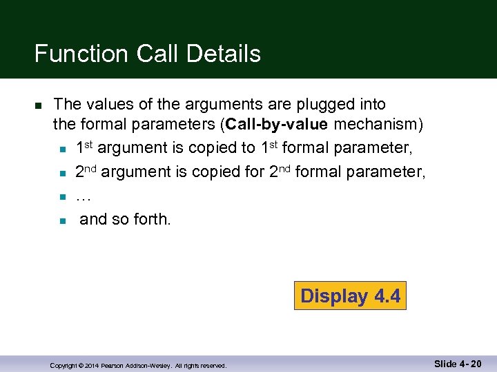 Function Call Details n The values of the arguments are plugged into the formal parameters (Call-by-value mechanism) st st n 1 argument is copied to 1 formal parameter, nd argument is copied for 2 nd formal parameter, n 2 n … n and so forth. Display 4. 4 Copyright © 2014 Pearson Addison-Wesley. All rights reserved. Slide 4 - 20