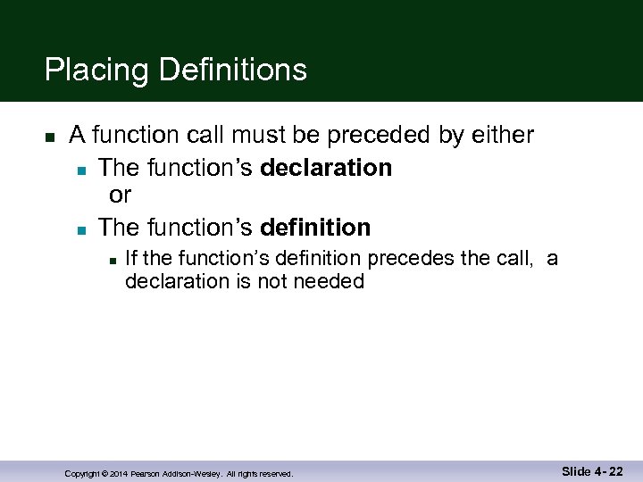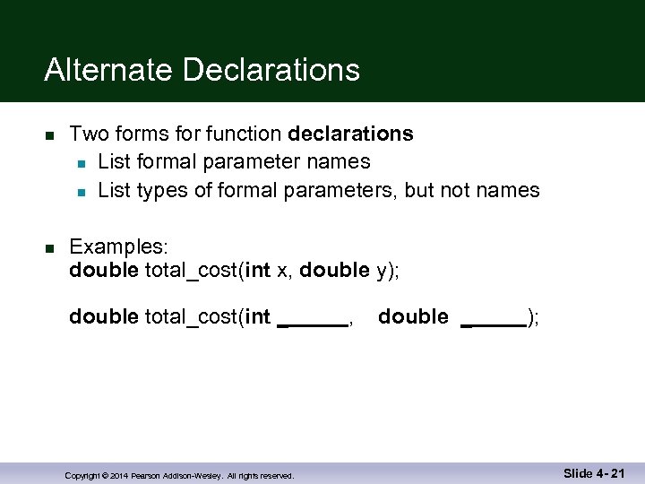 Alternate Declarations n n Two forms for function declarations n List formal parameter names n List types of formal parameters, but not names Examples: double total_cost(int x, double y); double total_cost(int _ Copyright © 2014 Pearson Addison-Wesley. All rights reserved. , double _ ); Slide 4 - 21