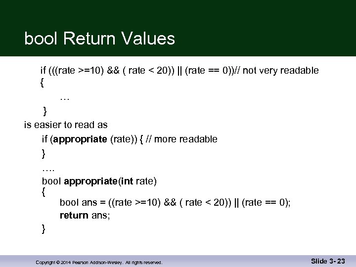 bool Return Values if (((rate >=10) && ( rate < 20)) || (rate == 0))// not very readable { … } is easier to read as if (appropriate (rate)) { // more readable } …. bool appropriate(int rate) { bool ans = ((rate >=10) && ( rate < 20)) || (rate == 0); return ans; } Copyright © 2014 Pearson Addison-Wesley. All rights reserved. Slide 3 - 23