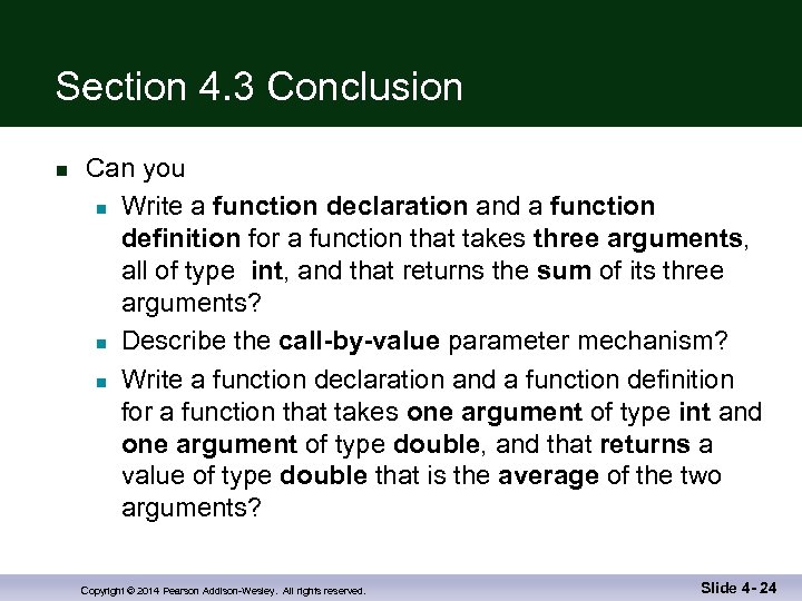 Section 4. 3 Conclusion n Can you n Write a function declaration and a function definition for a function that takes three arguments, all of type int, and that returns the sum of its three arguments? n Describe the call-by-value parameter mechanism? n Write a function declaration and a function definition for a function that takes one argument of type int and one argument of type double, and that returns a value of type double that is the average of the two arguments? Copyright © 2014 Pearson Addison-Wesley. All rights reserved. Slide 4 - 24
