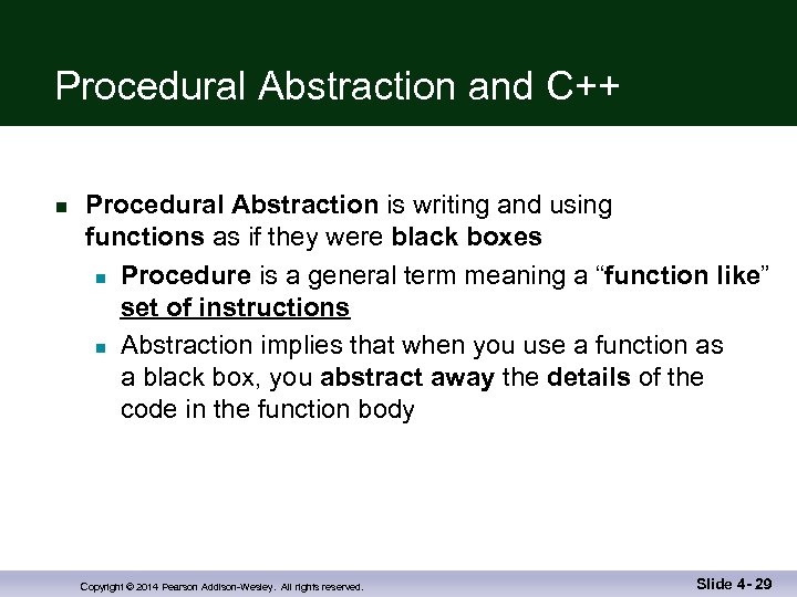 Procedural Abstraction and C++ n Procedural Abstraction is writing and using functions as if they were black boxes n Procedure is a general term meaning a “function like” set of instructions n Abstraction implies that when you use a function as a black box, you abstract away the details of the code in the function body Copyright © 2014 Pearson Addison-Wesley. All rights reserved. Slide 4 - 29