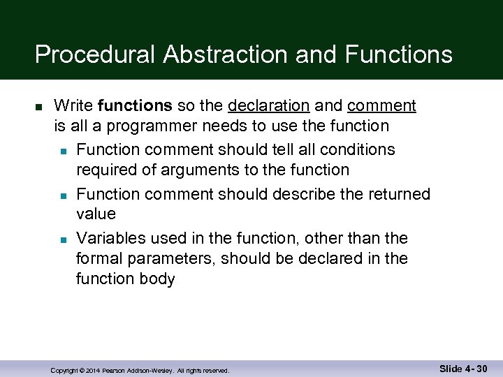 Procedural Abstraction and Functions n Write functions so the declaration and comment is all a programmer needs to use the function n Function comment should tell all conditions required of arguments to the function n Function comment should describe the returned value n Variables used in the function, other than the formal parameters, should be declared in the function body Copyright © 2014 Pearson Addison-Wesley. All rights reserved. Slide 4 - 30
