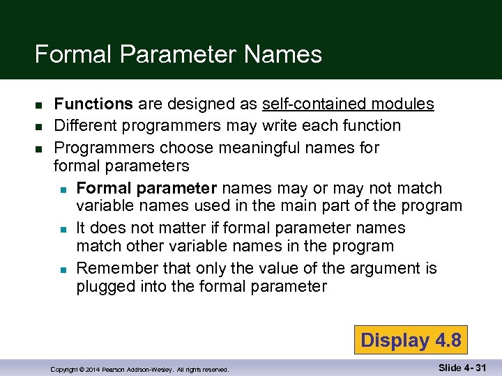Formal Parameter Names n n n Functions are designed as self-contained modules Different programmers may write each function Programmers choose meaningful names formal parameters n Formal parameter names may or may not match variable names used in the main part of the program n It does not matter if formal parameter names match other variable names in the program n Remember that only the value of the argument is plugged into the formal parameter Display 4. 8 Copyright © 2014 Pearson Addison-Wesley. All rights reserved. Slide 4 - 31